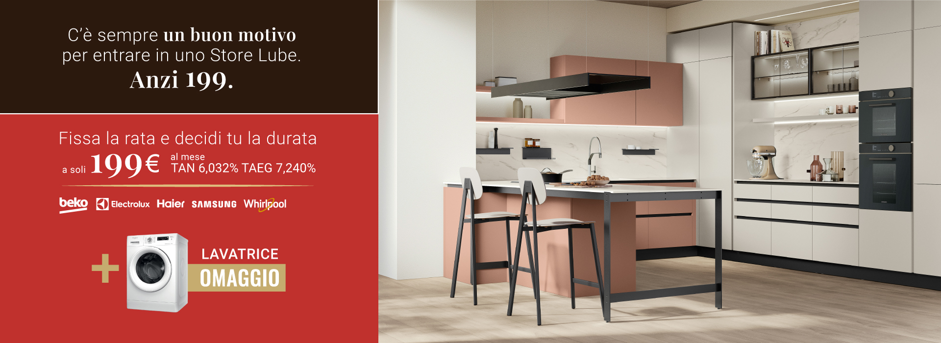 Dal 23 Febbraio al 7 Marzo puoi avere la tua cucina Lube alle condizioni più vantaggiose a partire da 199€ al mese. Scegli tu la rata e la durata del finanziamento, e in più hai una lavatrice in omaggio!